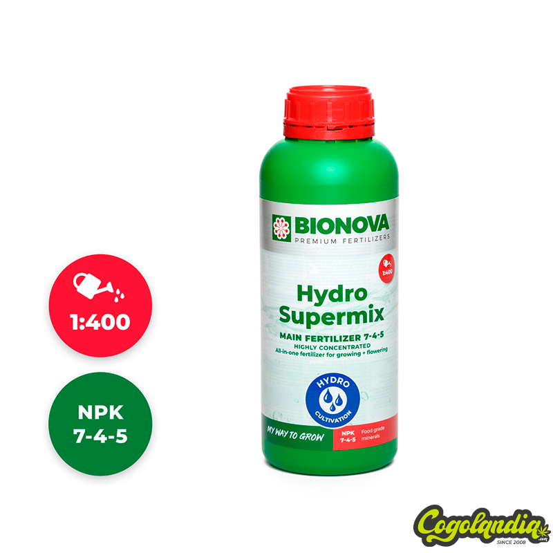 Hydro-Supermix de BIONOVA es un fertilizante base completo para el cultivo de marihuana durante las fases de crecimiento y floración en medios hidropónicos. Se trata de un fertilizante base orgánico que destaca por su efectividad y la rapidez en que las plantas lo asimilan al ser minerales quelatados de rápida absorción. Contiene todos lo macronutrientes y micronutrientes que las plantas necesitan para un desarrollo espectacular de raíces, tallos y hojas, con una floración explosiva desde el primer momento y unos cogollos resinosos y muy aromáticos. Incorpora extractos orgánicos vitalizantes que mejorará el sistema inmune de la planta, haciéndola más resistente a altas temperaturas o sequías.