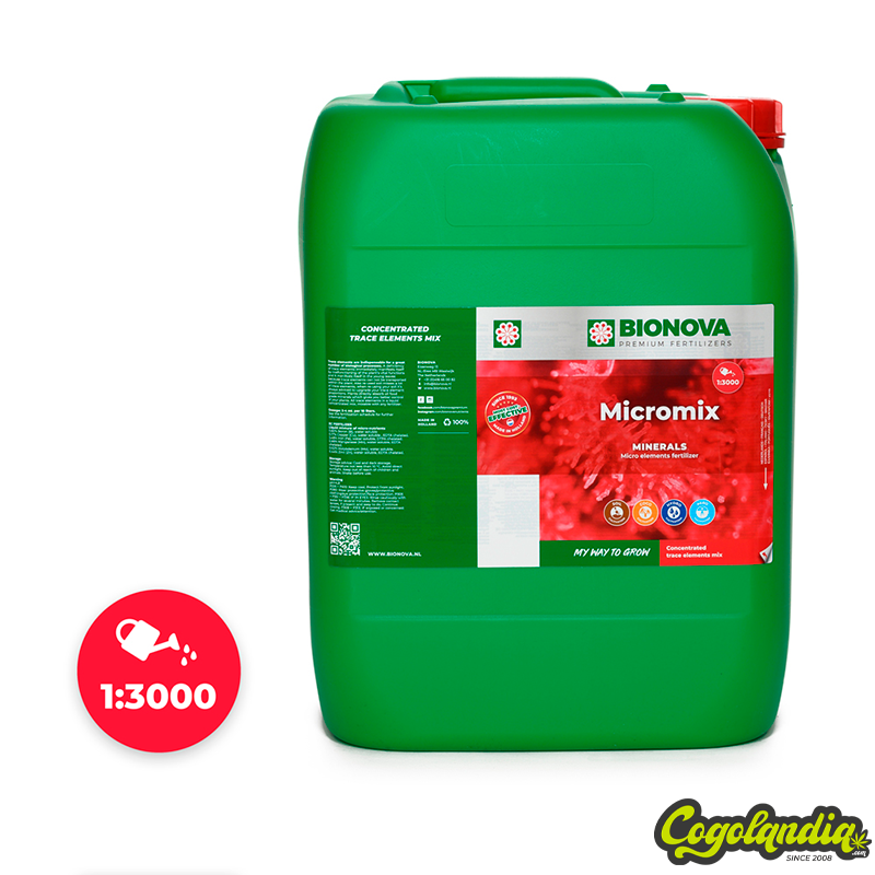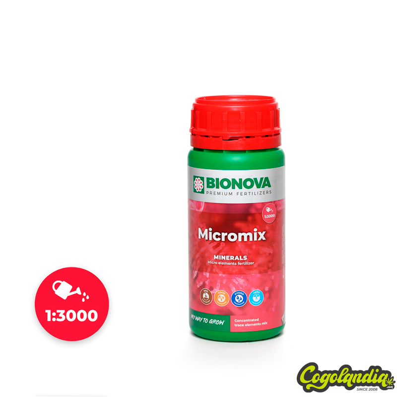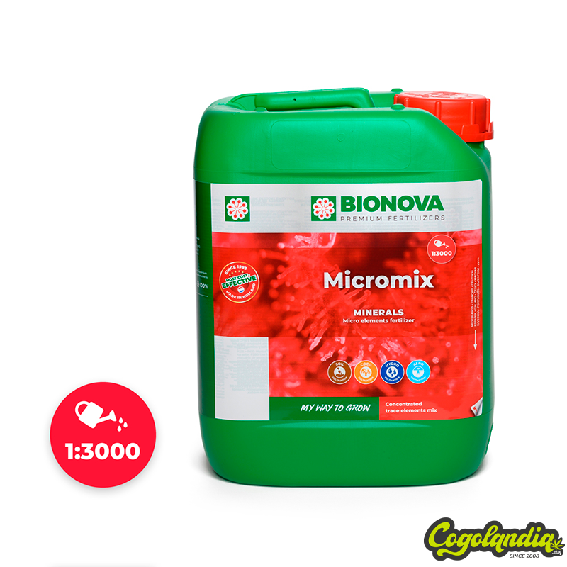 MicroMix de BIONOVA es un aditivo con base mineral para cultivos de marihuana, imprescindible para mejorar numerosos procesos biológicos en las plantas de marihuana cultivadas en cualquier medio. Contiene un 0,36% de hierro, 0,08% de manganesio, 0,4% de boro, 0,09% de zinc y 0,06% de molibdeno. El hierro indispensable para los sistemas enzimáticos y el transporte de energía durante la fotosíntesis, permitiendo que las plantas usen la energía que aportan los azúcares. El manganesio está relacionado con la respiración celular y la fotosíntesis. El boro juega un papel fundamental en el transporte de azúcares a través de la planta. El zinc actúa en la formación de la clorofila y es esencial como catalizador de las auxinas y enzimas. Y el molibdeno es necesario para la síntesis correcta de las proteínas.